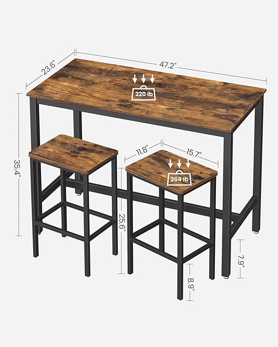 · A Set for Demanding Ones: A bar table and 2 bar stools with high-quality rustic brown finish—a wonderful addition to your kitchen, game room, or living room. The black steel frame not only forms an appealing contrast to the wood tone, but also serves as a practical footrest