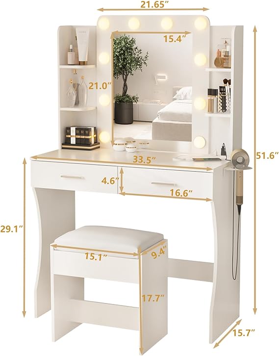 · The size of this dressing table set is 33.5"(L)x15.7"(W)x51.6"(H), it has a spacious tabletop and 2 large drawers that provide the perfect space to store and organize your precious lipsticks, eye shadows, makeup, perfumes, jewelry, other beauty supplies, and more in different places. And comes with a cushioned stool. Wonderful gifts for yourself, your wife, your mom, your girls.