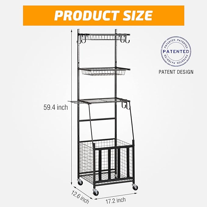 · 【Top Quality Steel & Safe Design】 This sports gear storage rack is made of high quality steel with powder coated finish, rust resistant and durable. Also, with top deep mesh basket, you don’t need to worry about items will fall off.