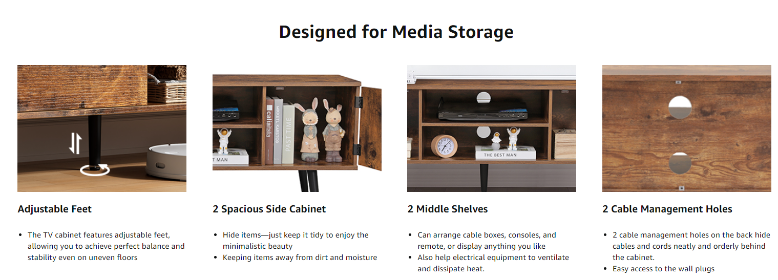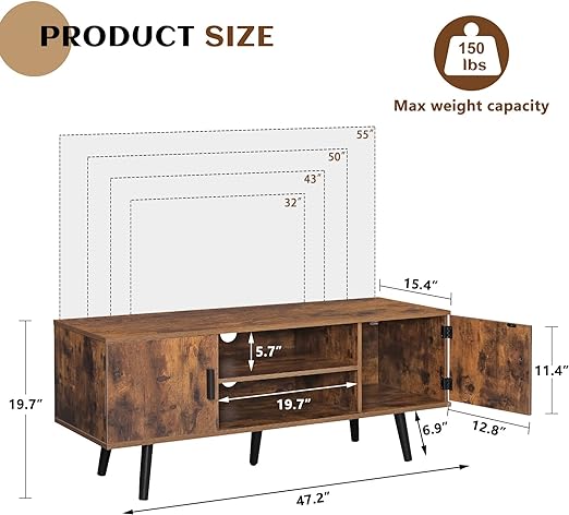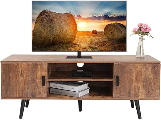 · ⭐【Store, Show, Hide】No boring storage here. Spacious tabletop make it can accommodate TVs up to 55 inches. The open shelves can display game consoles, STBs, multi-media devices and décor. Side cabinets on each side can put CDs, books, storage baskets and other sundries, providing you with ample hidden storage space. It will make your living room more neat and organized.
