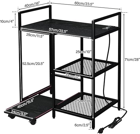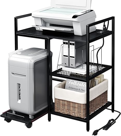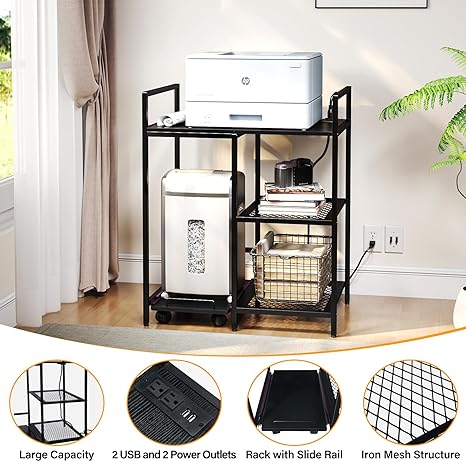 · - With power socket: Say goodbye to tangled cords and messy cables!! The printer stand has 2 built-in power sockets and 2 USB charging ports that can charge your office electronic devices such as printers, shredders, scanners, phones, headphones, tablets, etc, making it ideal for your daily digital needs. This is a true combination of fashion and function.