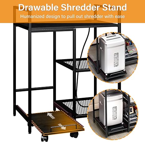 · -Slide-out shelf: Equipped with a Slide-out keyboard tray. The left side shelf with metal slides and casters can store shredders or computer host shelves for easy access,while saving desktop space. It prevents shaking on uneven ground. It is more comfortable to use The shredder without squatting.