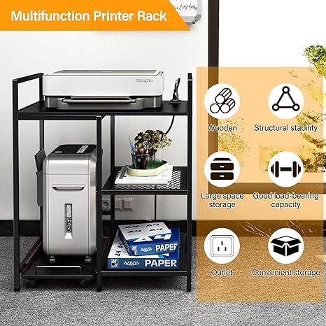 · - Large capacity: This multi-functional printer stand is designed to blend well with most office furniture and home decor. It has a very large storage capacity with three layers that can accommodate printers, scanners, shredders, and fax machines. The user-friendly design makes office organization more effortless and work efficiency higher.