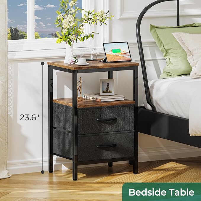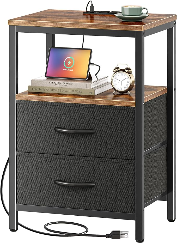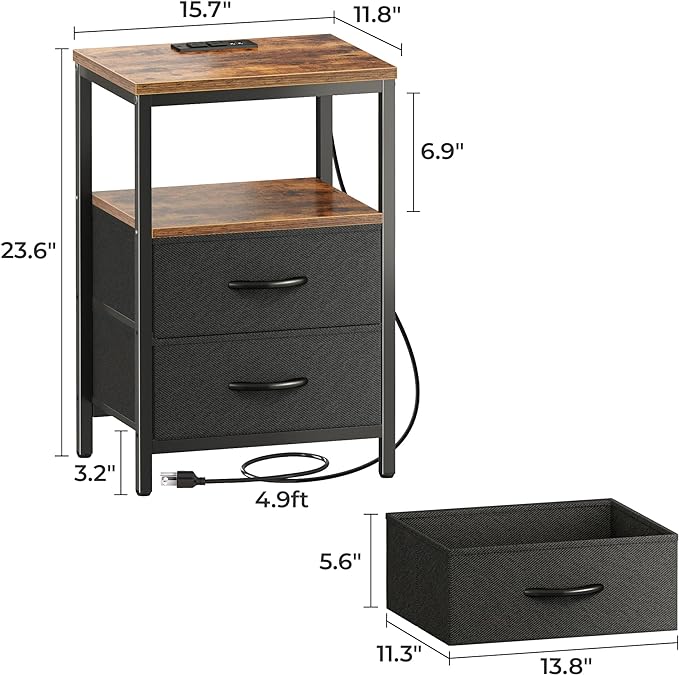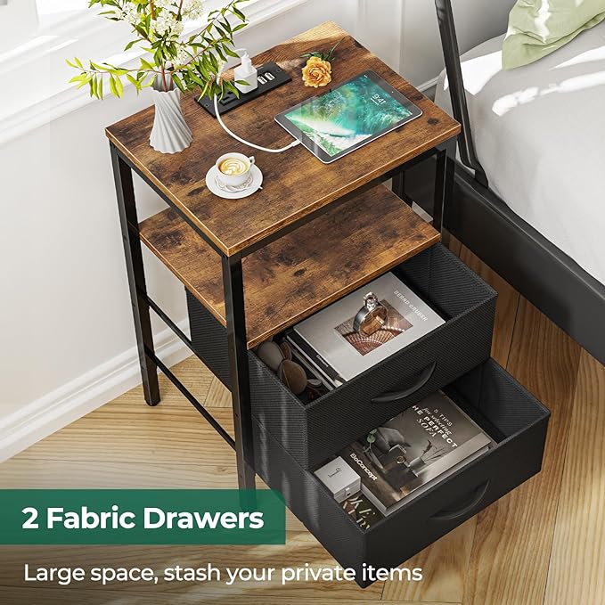 Nightstand with Charging Station, Side Table with Fabric Drawers, End Table with Open Shelf, Bedside Table with USB Ports and Outlets, Night Stand for Bedroom, Rustic Brown and Black