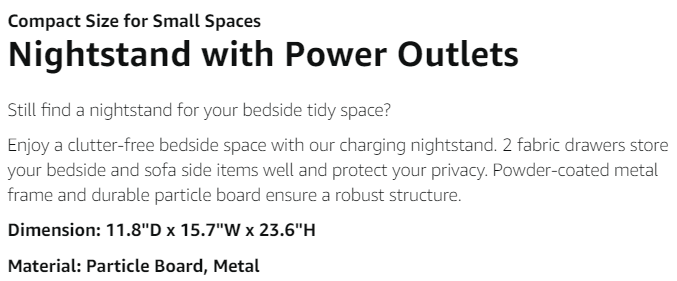 · 【Night Stand with Charger Station】Add 2 AC outlets and 2 USB ports, more charging spots for bedtime, plug in your phones and turn on your lamps, this nightstand with drawer will comfort your bedtime with convenient charging. Plus: Contain patent pending drawer slide