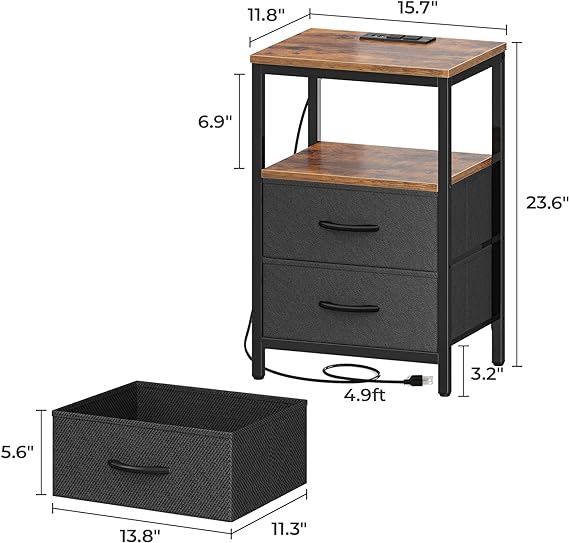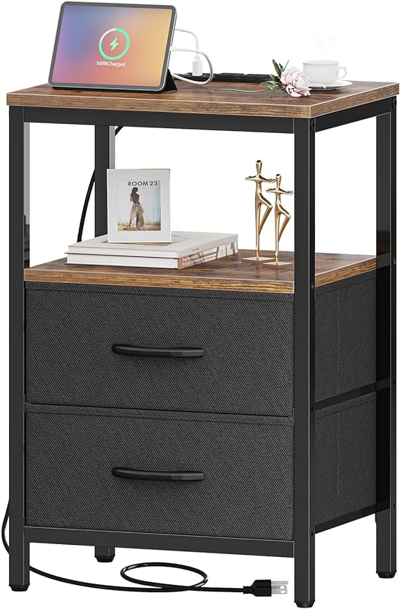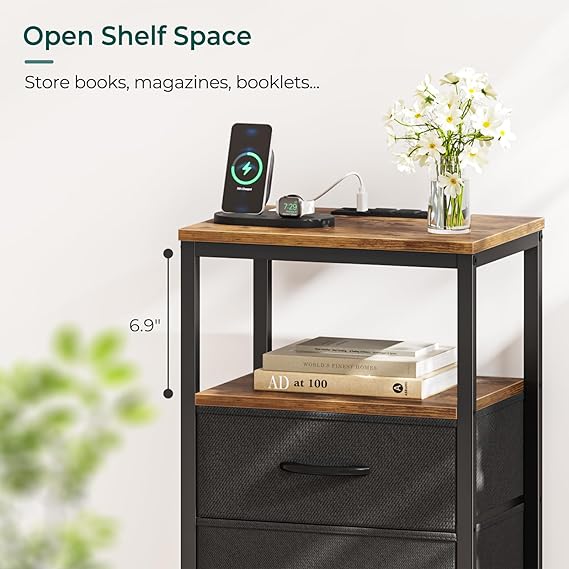 Nightstand with Charging Station, Side Table with Fabric Drawers, End Table with Open Shelf, Bedside Table with USB Ports and Outlets, Night Stand for Bedroom, Rustic Brown and Black