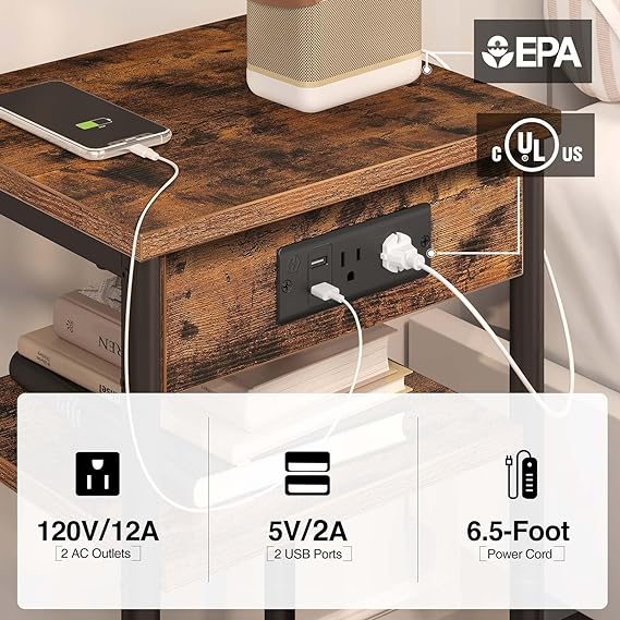 · Sofa/ Bed Side Table with Charging Station - 2 standard plug outlets & 2 USB ports with 6.5 ft long power supply cord, which help you charge your phone, tablet, lamp, and game console at the same time.