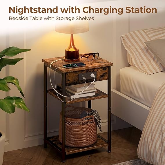 End Table with Charging Station, 3 Tier Slim Nightstand with Storage Shelf, Narrow Side Table with USB Ports & Power Outlets, Steel Frame for Living Room, Bedroom, Rustic Brown