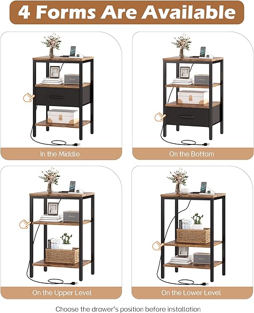 · [Fabric Drawer Install Up or Down]: 2 install positions of the drawer are available, you can install it for needed storage heights. 3 storage shelves and 1 fabric drawer on the bedside table are surely enough to store various items