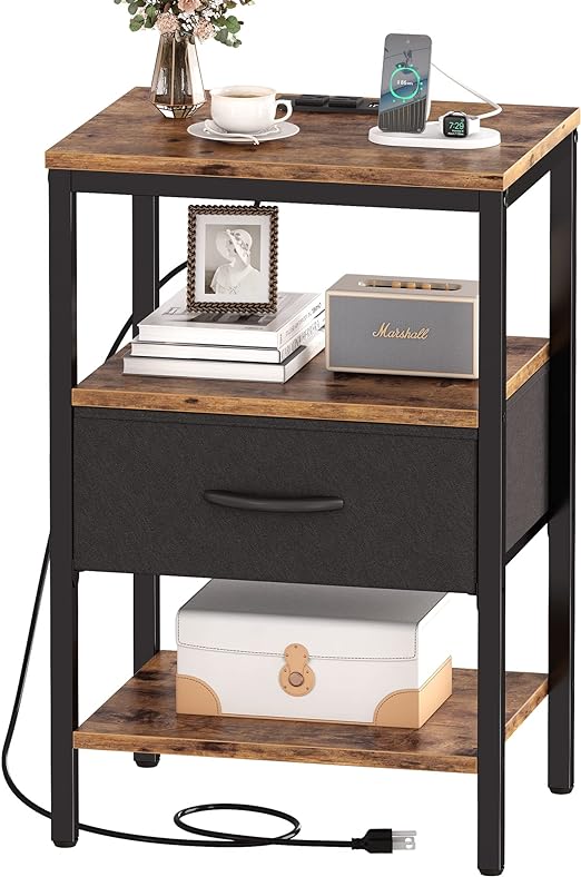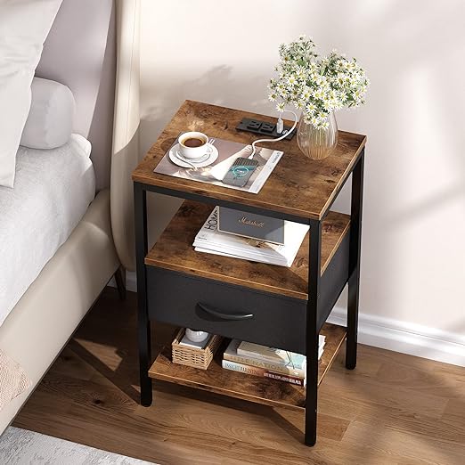 Nightstand with Charging Station, Bed Side Table with Adjustable Fabric Drawer, Night Stand for Bedroom, 3-Tier Storage End Table, for Living Room, Rustic Brown and Black