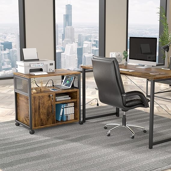 DX Lateral File Cabinet, Locking Office Filing Cabinets with Socket and USB Charging Port, Modern Rolling Printer Stand with Storage for A4, Letter Size and File Folders, Rustic Brown
