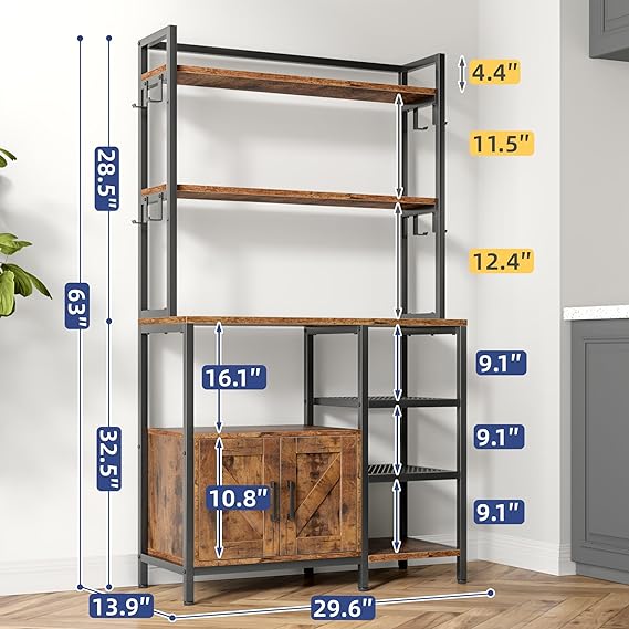 · 【Large Kitchen Bakers Rack with Hutch Provides Ample Space】 This bakers rack with storage sizes 29.6''W x 13.9''D x 63''H, with 1 big wooden board, 2 tier spice rack, 3 layer storing shelf and a deep cabinet, this bakers racks for kitchen and coffee bar center saves your place.