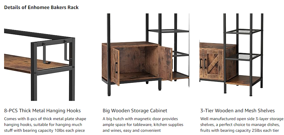 · 【Sturdy Kitchen Hutch with Storage Cabinet Build to Last】 Combine well-manufactured metal frame with solid wood boards, this bakers rack with storage serves for years without wobbling. No worry about load capacity as this industrial bakers rack bears max 230 lbs.