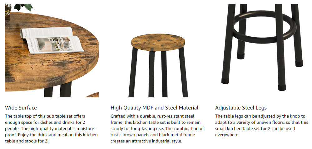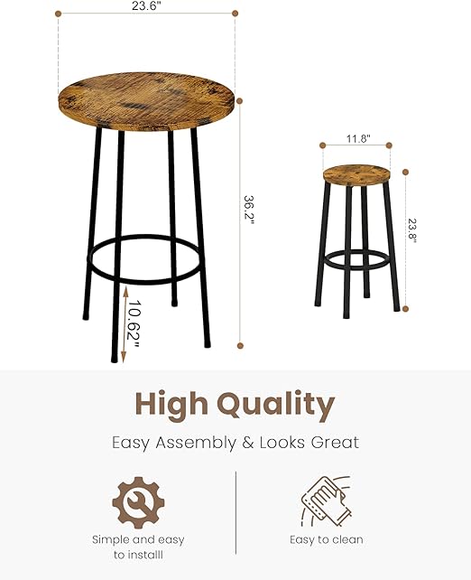 · Super Sturdy & Stable Construction - 3 Piece Pub Dining Set: This 23” round pub table set is made of premium MDF and sturdy metal frame, which is corrosion-resistant and durable for a long lifespan. The bar table made of thick board and thick metal which ensures stability and durability. The legs are super stable on the floor, with no wobbling issue at all. The weight capacity of the stool is up to 250lbs.